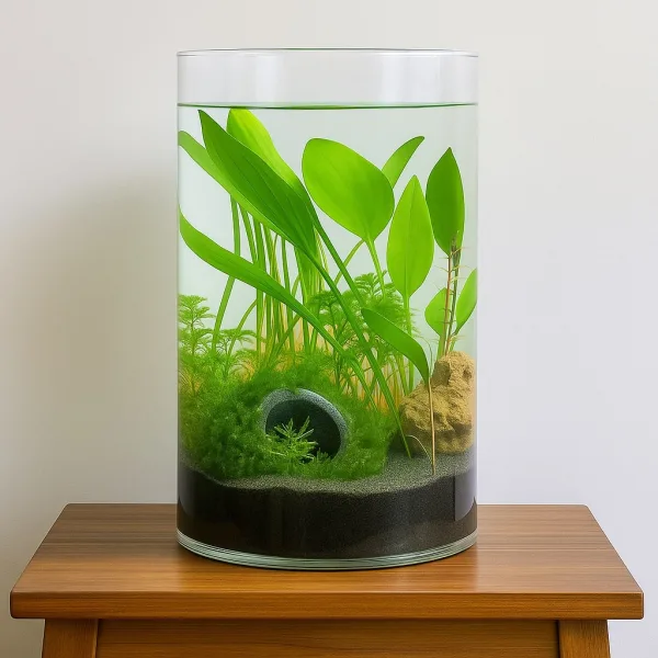 Forget artificial decorations! This cylinder aquarium is fully natural, featuring real plants that grow, thrive, and even require trimming like garden plants. These plants help maintain water quality by absorbing toxins, reducing the need for frequent cleaning.