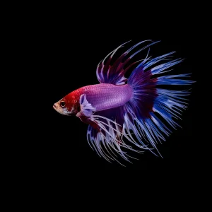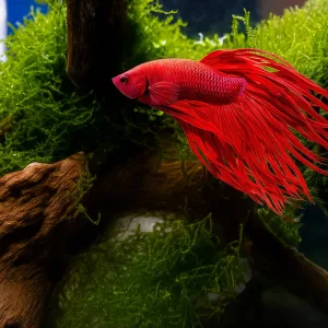 Crowntail Betta Fish (Betta splendens) are recognized by their dramatic, spiky tail and fin rays that resemble a crown. Their fins are fringed and jagged, giving them an aggressive, regal appearance. Available in bold colors like red, blue, black, white, and multicolor patterns, they stand out even in minimal setups.