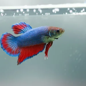 Female Betta Fish (Betta splendens) showcase elegant short fins and come in a wide range of colors, including metallic blues, deep reds, whites, and multicolor variations. Though less flashy than males, they are equally vibrant and well-suited for both display and community aquariums.