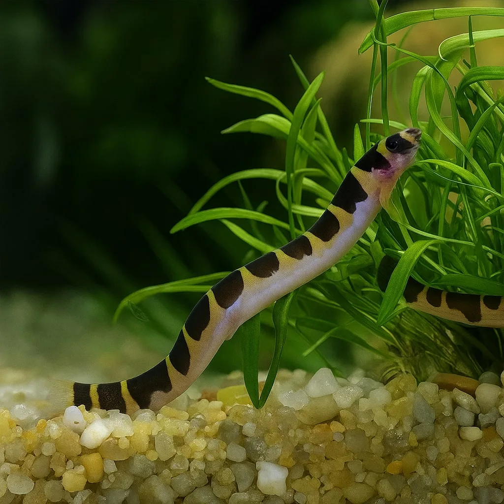 Kuhli Loach (Pangio kuhlii) is a slender, eel-like fish known for its banded appearance. With a body that is typically 4 inches (10 cm) long, these loaches have a yellow-brown or light tan body with darker vertical stripes that give them a distinctive look. Their elongated, snake-like shape makes them fascinating and fun to watch, especially as they burrow into the substrate.