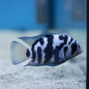 The Polar Blue Convict Parrot Cichlid is a stunning hybrid species, a cross between the Convict Cichlid and the Blood Parrot Cichlid. Known for its brilliant blue coloration, compact body, and distinct vertical stripes, this fish makes a unique and eye-catching addition to any freshwater aquarium.