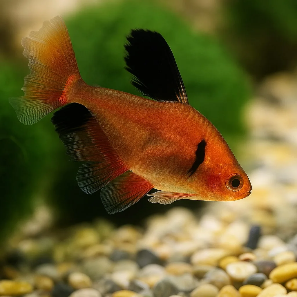 Serpae Tetras (Hyphessobrycon eques) are small but striking fish with a vivid red-orange body, accented by black tips on their fins. These fish grow to about 2 inches (5 cm) in length and are ideal for aquariums with well-planted sections and moderate lighting. Their bright coloration stands out beautifully, especially in schools of 6 or more.